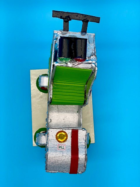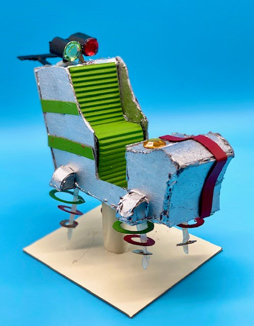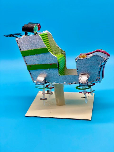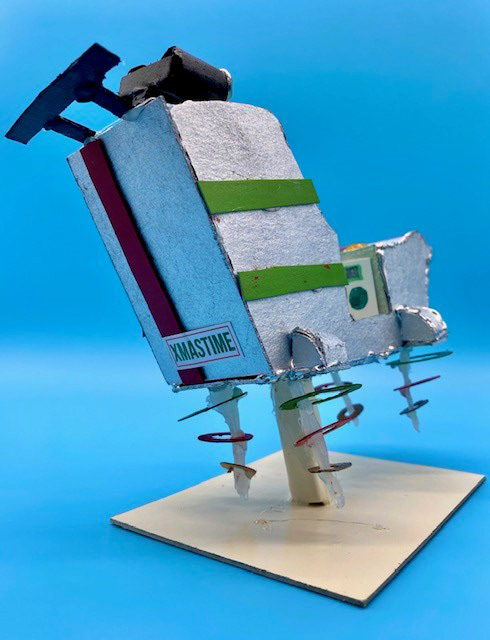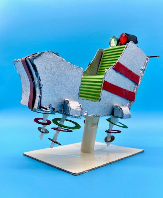 Cardboard, Hot Glue, Spray Paint, Rhinestones, Stickers, and Crinkle Paper, 6 x 7 x 3.5"